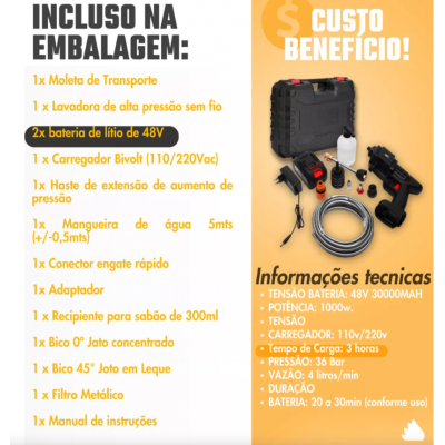باتری طولانی مدت: حدود 40 دقیقه مدت باتری. یک بار می تواند 2 تا 3 بار ماشین را بشوید